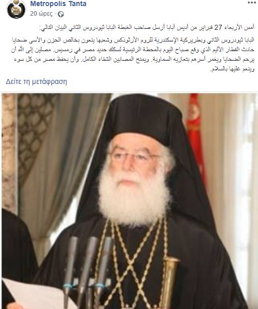 Την λύπη του για το τραγικό δυστύχημα που συνέβη την Τετάρτη 27 Φεβρουαρίου 2019, στον σιδηροδρομικό σταθμό του Καΐρου «Ραμσής», εκφράζει ο Πάπας και Πατριάρχης Αλεξανδρείας κ. Θεόδωρος. Στο σιδηροδρομικό δυστύχημα έχασαν την ζωή τους 25 άνθρωποι και τραυματίσθηκαν τουλάχιστον 40 .