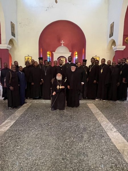 Ο Πατριάρχης Αλεξανδρείας Θεόδωρος με τον Τοποτηρητής της Μητροπόλεως, Μητροπολίτη Γουινέας κ. Γεώργιο, και κληρικούς της Νιγηρίας (Πηγή φωτο: Πατριαρχείο Αλεξανδρείας)