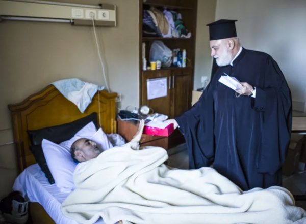 Τον υποδέχτηκε ο Προϊστάμενος του Νοσοκομείου και Ταμίας της ΕΚΚ κ. Αντώνης Ιορδανίδης μαζί με τον Διευθυντή του Νοσοκομείου Δρ. Σαμουήλ Λουίς και την Προϊσταμένη του Γηροκομείου κα Αγγέλα Χαραλαμποπούλου. Πρώτος σταθμός, όπως πάντα, η εκκλησία του Αγίου Παντελεήμονα, όπου ο Μακαριώτατος άναψε ένα κερί, προσευχήθηκε και θαύμασε τον άψογα φροντισμένο Ιερό Ναό.