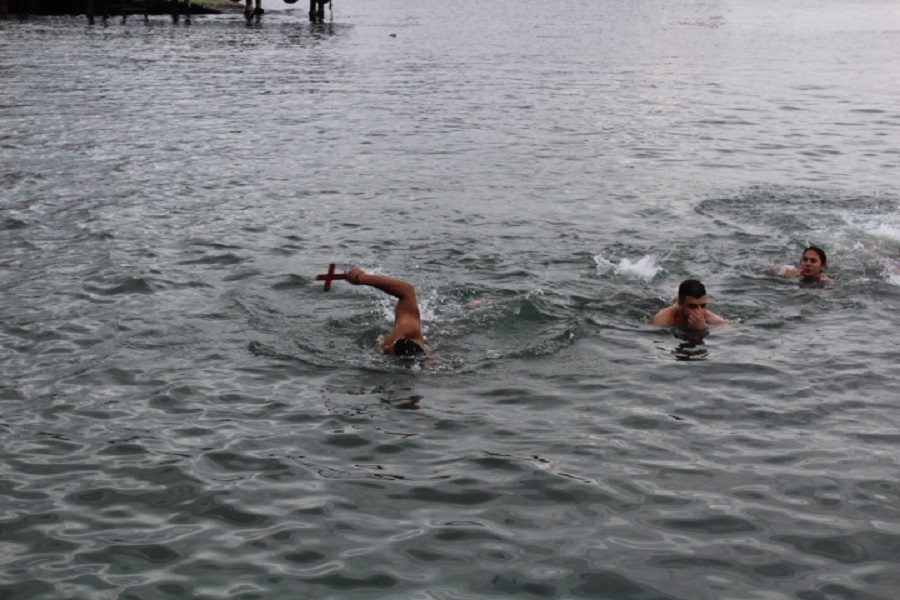 Αμέσως μετά ο Πατριάρχης, ο ιερός κλήρος, οι αρχές και οι πιστοί μετέβησαν στις εγκαταστάσεις του Ελληνικού Ναυτικού Ομίλου Αλεξανδρείας (Ε.Ν.Ο.Α.), όπου ἐλαβε χώρα η τελετή του αγιασμού των υδάτων. Πέντε ελληνόπουλα έπεσαν στα παγωμένα νερά της θαλάσσης για να ανασύρουν τον Τίμιο Σταυρό. Προς αυτά ο Μακαριώτατος προσέφερε αναμνηστικά δώρα και ευλογίες.