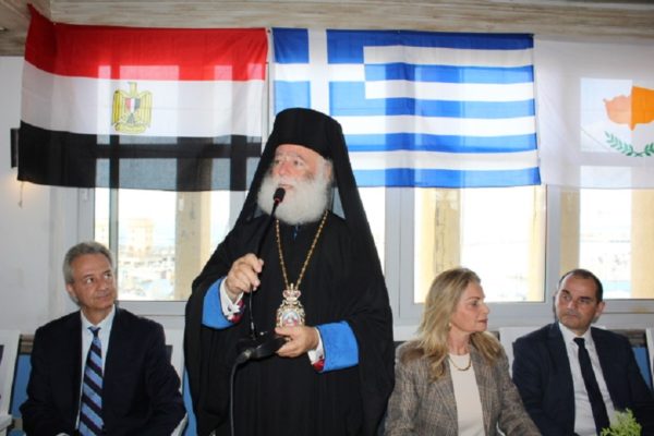Εν συνεχεία ο Αλεξανδρινός Προκαθήμενος ευλόγησε την Αγιοβασιλόπιττα του Ελληνικού Ναυτικού Ομίλου. Στον σύντομο χαιρετισμό του, αφού συνεχάρη την Πρόεδρο του Ε.Ν.Ο.Α. κα. Λιλίκα Θλιβίτου και τα μέλη του ΔΣ για την πολυσχιδή δράση τους, ανεφέρθη στην συνύπαρξη των χωρών της ανατολικής Μεσογείου και την επιτακτική ανάγκη της επικράτησης της ειρηνικής γειτονίας, της αλληλεγγύης και της αρμονικής συνεργασίας, υπογραμμίζοντας με ιδιαίτερη έμφαση ότι «η Μεσόγειος πρέπει να παραμείνει η θάλασσα που πάντοτε θα ενώνει τους λαούς γύρω της σε μία διαλογική και εποικοδομητική συνύπαρξη. Δεν πρέπει ποτέ να επιτρέψουμε να λειτουργήσει ως “υδάτινο τείχος” διαίρεσης και απομονώσεως μεταξύ τους». Ακολούθησε παράθεση εορτίου δεξιώσεως προς τιμήν του Πατριάρχου, των αρχών και όλων των παρισταμένων.