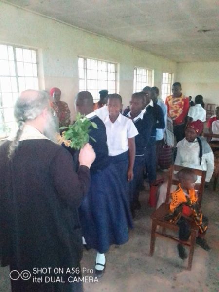 Στη συνέχεια, μετέβη στο σχολείο, όπου έγινε ο αγιασμός για την έναρξη του νέου Σχολικού έτους. Παρόντες ήταν τέσσερεις Ιερείς: ο π. Παύλος, ο π. Ιερώνυμος, ο π. Παύλος και π. Μάρκος, ο Διευθυντής του Σχολείου κ. Τζόστο ουν Μουζούγκου, οι καθηγητές και οι μαθητές.