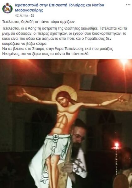 “Τετέλεσται, δηλαδή τα πάντα τώρα αρχίζουν” αναφέρει σε επίκαιρη ανάρτησή της, η Ιεραποστολή στην Επισκοπή Τολιάρας και Νοτίου Μαδαγασκάρης υπό του Θεοφιλεστάτου Επισκόπου, κ. Προδρόμου.