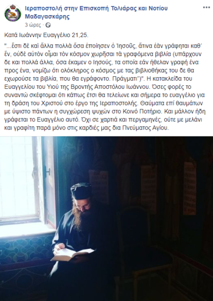 “Κατά Ιωάννην Ευαγγέλιο 21,25. “…ἔστι δὲ καὶ ἄλλα πολλὰ ὅσα ἐποίησεν ὁ Ἰησοῦς, ἅτινα ἐὰν γράφηται καθ᾿ ἕν, οὐδὲ αὐτὸν οἶμαι τὸν κόσμον χωρῆσαι τὰ γραφόμενα βιβλία (υπάρχουν δε και πολλά άλλα, όσα έκαμεν ο Ιησούς, τα οποία εάν ήθελαν γραφή ένα προς ένα, νομίζω ότι ολόκληρος ο κόσμος με τας βιβλιοθήκας του δε θα εχωρούσε τα βιβλία, που θα εγράφοντο. Πράγματι”)”. Η κατακλείδα του Ευαγγελίου του Υιού της Βροντής Αποστόλου Ιωάννου” αναφέρει ο Θεοφιλέστατος Επίσκοπος Τολιάρας και Νοτίου Μαδαγασκάρης κ. Πρόδρομος σε επίκαιρη ανάρτηση του.