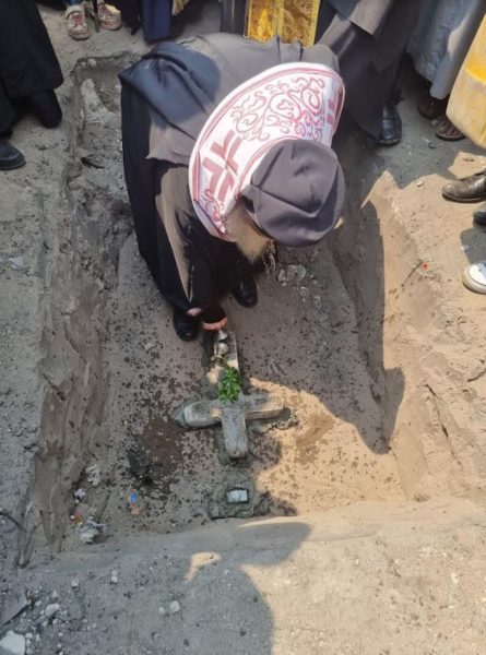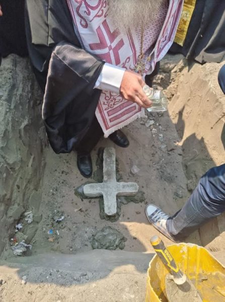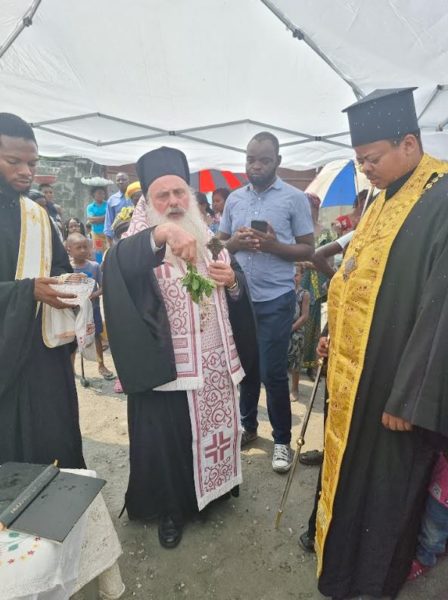 Με την συμμετοχή του Πρωτοσυγκέλλου Αρχιμανδρίτη π. Γεράσιμου Belesi, του Αρχιμανδρίτη π. Ανδρέα Nsaka, των πρεσβυτέρων π. Κυρίλλου, π. Θεοδώρου καθώς και των διακόνων π. Παϊσίου και π. Εφραίμ τελέσθηκε ο αγιασμός και τέθηκε ο θεμέλιος λίθος. Επ’ ευκαιρία ο Μητροπολίτης εξέφρασε την χαρά του για την ανέγερση του νέου ναού, έτσι ώστε οι πιστοί να μην εκκλησιάζονται πλέον μέσα στις λαμαρένιες αποθήκες. Στη συνέχεια τόνισε, πως η Παναγία θα σκεπάζει και θα προστατεύει όλο τον τόπο που ετέθη ο θεμέλιος λίθος ως τόπον ιερό.