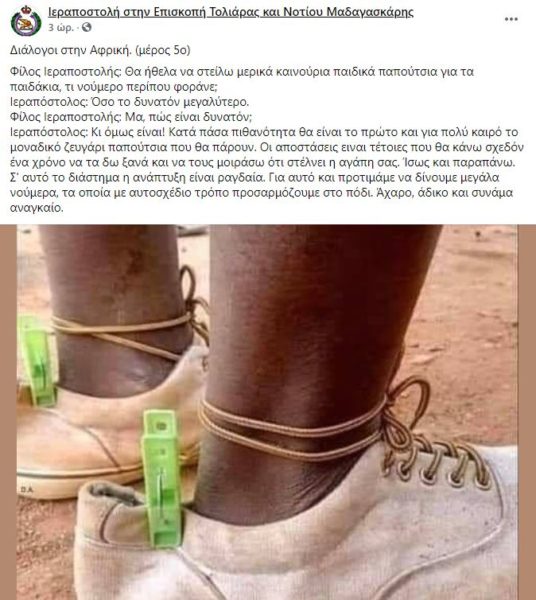 Ιεραπόστολος: Κι όμως είναι! Κατά πάσα πιθανότητα θα είναι το πρώτο και για πολύ καιρό το μοναδικό ζευγάρι παπούτσια που θα πάρουν. Οι αποστάσεις ειναι τέτοιες που θα κάνω σχεδόν ένα χρόνο να τα δω ξανά και να τους μοιράσω ότι στέλνει η αγάπη σας. Ίσως και παραπάνω. Σ’ αυτό το διάστημα η ανάπτυξη είναι ραγδαία. Για αυτό και προτιμάμε να δίνουμε μεγάλα νούμερα, τα οποία με αυτοσχέδιο τρόπο προσαρμόζουμε στο πόδι. Άχαρο, άδικο και συνάμα αναγκαίο.