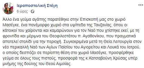 Όπως σημειώνουν άλλωστε με έμφαση σε μέσο κοινωνικής δικτύωσης τα μέλη της Ιεραποστολικής Στέγης “Άλλο ένα γεύμα αγάπης παρατέθηκε στην Επισκοπή μας στο χωριό Μασέγκε, ένα πανέμορφο χωριό στα υψίπεδα της Τανζανίας, όπου οι κάτοικοί του χαίρονται και καμαρώνουν για τον Ναό που χτίστηκε εκεί, με τη φροντίδα και μέριμνα του Θεοφιλεστάτου π. Αγαθονίκου, που πραγματικά αποτελεί στολίδι για την περιοχή. Συγκεκριμένα μετά τη Θεία Λειτουργία στον νέο περικαλλή Ναό των Αγίων Παϊσίου του Αγιορείτου και Λουκά του Ιατρού, ο οποίος δεσπόζει σε περίοπτη θέση στο χωριό Μασέγκε, προσφέρθηκε γεύμα σε όλους τους πιστούς, προσφορά της κ. Κατσαβούνη Χρύσας υπέρ μνήμης της δούλης του Θεού Αιμιλίας”.