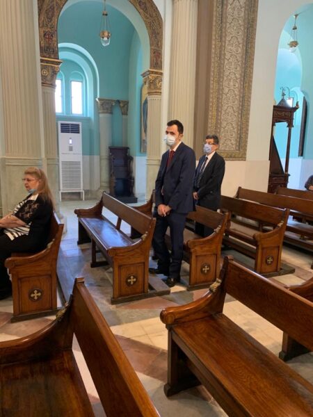 Με κατάνυξη και συγκίνηση, αλλά λαμβάνοντας και όλα τα απαραίτητα μέτρα προστασίας λόγω κοροναϊού, οι παρευρισκόμενοι μετείχαν στη Θεία Λειτουργία την οποία τίμησαν με την παρουσία τους εκ μέρους των διπλωματικών αρχών της Ελλάδος και της Κύπρου, οι κ.κ. Αχιλλέας Μπικής, Πρόξενος και Αριστόδημος Ασσιώτης, Διοικητικός Ακόλουθος.