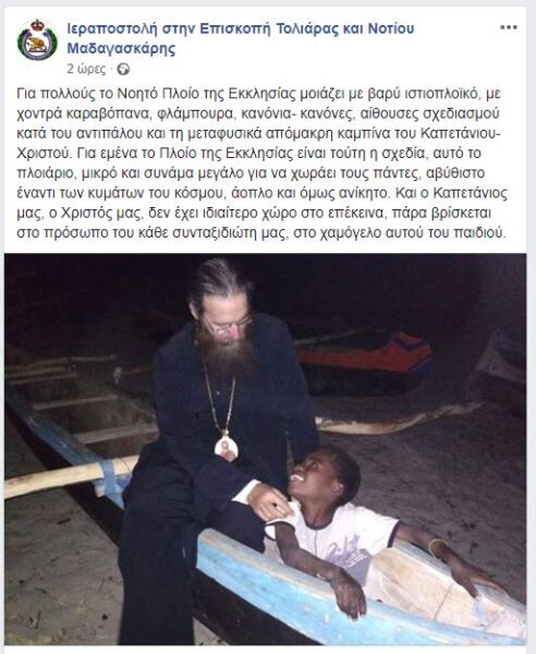Η σελίδα “Ιεραποστολή στην Επισκοπή Τολιάρας και Νοτίου Μαδαγασκάρης” δημοσιεύει επίκαιρο κείμενο, το οποίο και παρατίθεται, συνοδευόμενο απο την ως άνω φωτογραφική στιγμή του Επισκόπου Τολιάρας και Νοτίου Μαδαγασκάρης, κ. Προδρόμου: