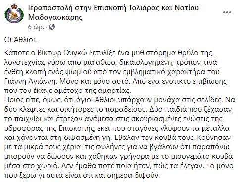 Τα παρακάτω συγκλονιστικά λόγια που αφυπνίζουν συνειδήσεις αναφέρει σε επίκαιρη ανάρτησή του, ο Θεοφιλέστατος Επίσκοπος Τολιάρας και Νοτίου Μαγαδασκάρης κ. Πρόδρομος: