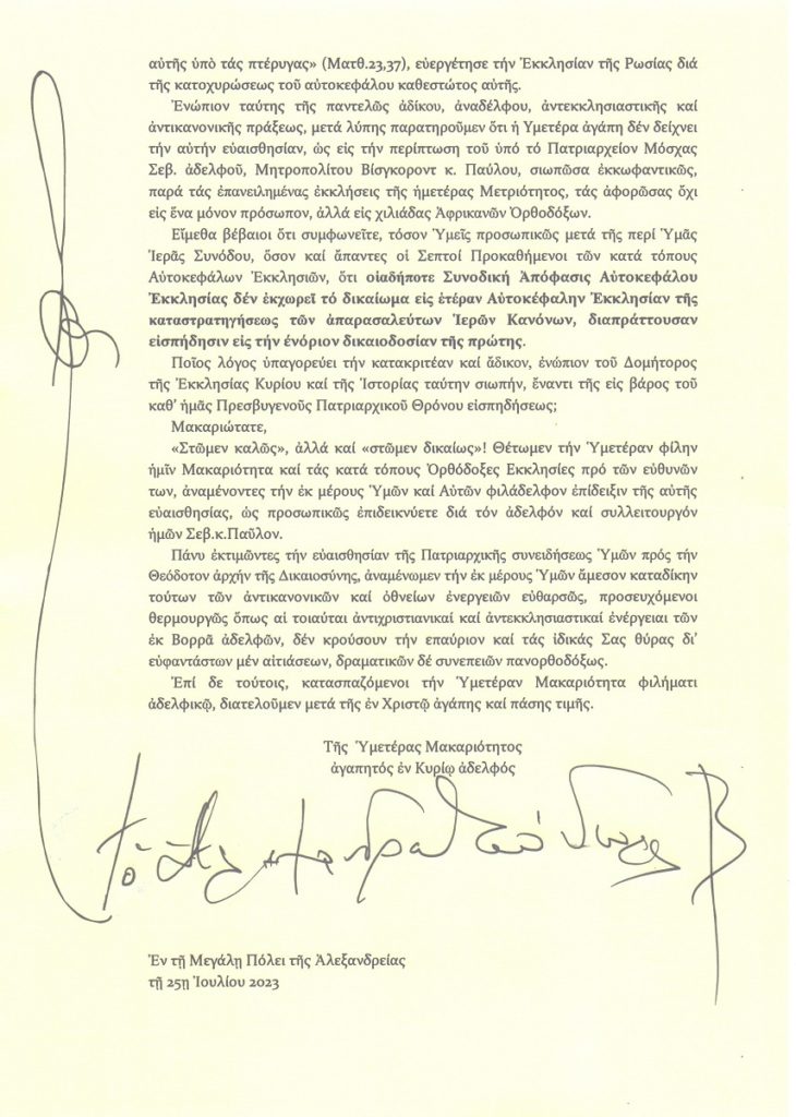 Εἰς καιρούς κρισίμους διά τήν ἀνθρωπότητα καί τόν χριστιανικόν κόσμον –ὡς καί Ὑμεῖς ἀναγνωρίζετε σαφῶς, ἀναφερόμενος εἰς τό Ὑμέτερον Γράμμα περί τῆς Οὐκρανίας «πού ἔχει τυλιχτεῖ στίς φλόγες», ὡς γράφετε, ἀλλά δέν κατονομάζετε τόν ὑπαίτιον τοῦ ἐπιθετικοῦ τούτου πολέμου εἰς βάρος ὁμοδόξου λαοῦ– οἱ Ρώσοι Ὀρθόδοξοι άδελφοί ἡμῶν κατακερματίζουν ἐνσυνειδήτως τόν ἄρραφον χιτῶνα τοῦ Ἀρχιποίμενος Χριστοῦ, ἀντιπελαργοῦντες ὄξος καί χολήν πρός τήν Δευτερόθρονον Ἐκκλησίαν τῶν Ἀλεξανδρέων, ἡ Ὁποία «ὅν τρόπον ὄρνις ἐπισυνάγει τά νοσσία αὐτῆς ὑπὸ τάς πτέρυγας» (Ματθ.23,37), εὐεργέτησε τήν Ἐκκλησίαν τῆς Ρωσίας διά τῆς κατοχυρώσεως τοῦ αὐτοκεφάλου καθεστώτος αὐτῆς.