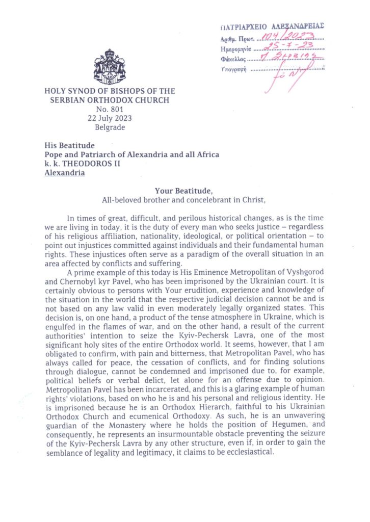 Ἐλάβομεν τό ἀπό 22ας Ἰουλίου ἐ.ἔ ὑπ’ ἀριθμ.801 ἀδελφικόν Γράμμα τῆς Ὑμετέρας Μακαριότητος, διά τοῦ ὁποίου διετραγωδεῖτε τήν κατάστασιν τοῦ ἐν Οὐκρανίᾳ διακονοῦντος Σεβ. Μητροπολίτου Βίσγκοροντ καί Τσερνόμπιλ κ.Παύλου, τῆς ἐκκλησιαστικῆς δικαιοδοσίας τοῦ Πατριαρχείου Μόσχας.