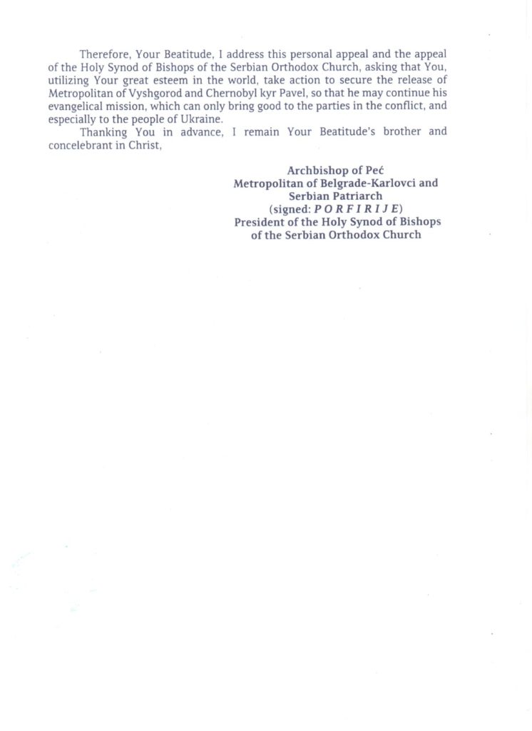 Γι’ αυτό, Μακαριώτατε, απευθύνω αυτήν την προσωπική έκκληση και την έκκληση της Ιεράς Συνόδου των Επισκόπων της Σερβικής Ορθόδοξης Εκκλησίας, ζητώντας από εσάς, αξιοποιώντας τη μεγάλη σας εκτίμηση στον κόσμο, να λάβετε μέτρα για να εξασφαλίσετε την απελευθέρωση του Μητροπολίτη Βίσγκοροντ και Τσερνομπίλ κυρίου Παύλου, ώστε να συνεχίσει την ευαγγελική αποστολή του, που μόνο καλό μπορεί να φέρει στα μέρη της σύγκρουσης, και ιδιαίτερα στον λαό της Ουκρανίας.
