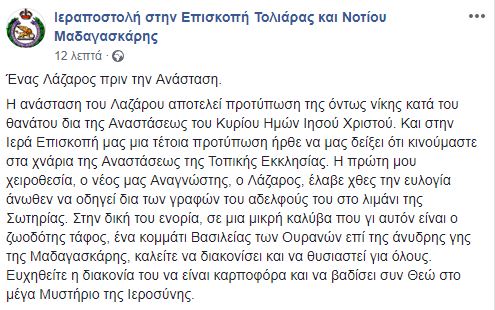 Η ανάσταση του Λαζάρου αποτελεί προτύπωση της όντως νίκης κατά του θανάτου δια της Αναστάσεως του Κυρίου Ημών Ιησού Χριστού. Και στην Ιερά Επισκοπή μας μια τέτοια προτύπωση ήρθε να μας δείξει ότι κινούμαστε στα χνάρια της Αναστάσεως της Τοπικής Εκκλησίας. Η πρώτη μου χειροθεσία, ο νέος μας Αναγνώστης, ο Λάζαρος, έλαβε χθες την ευλογία άνωθεν να οδηγεί δια των γραφών του αδελφούς του στο λιμάνι της Σωτηρίας. Στην δική του ενορία, σε μια μικρή καλύβα που γι αυτόν είναι ο ζωοδότης τάφος, ένα κομμάτι Βασιλείας των Ουρανών επί της άνυδρης γης της Μαδαγασκάρης, καλείτε να διακονίσει και να θυσιαστεί για όλους. Ευχηθείτε η διακονία του να είναι καρποφόρα και να βαδίσει συν Θεώ στο μέγα Μυστήριο της Ιεροσύνης.