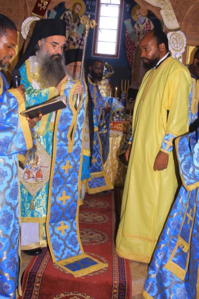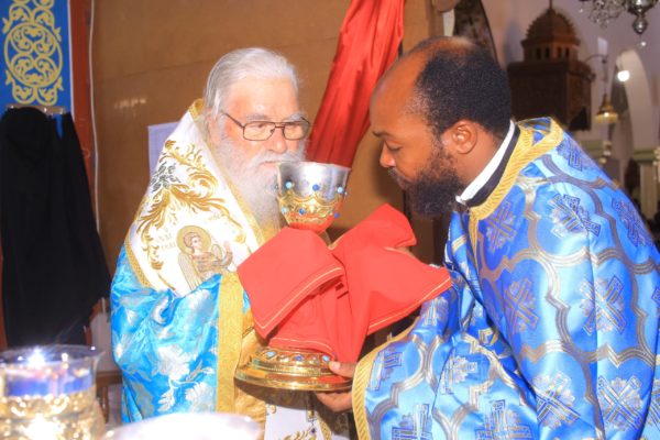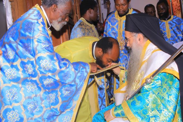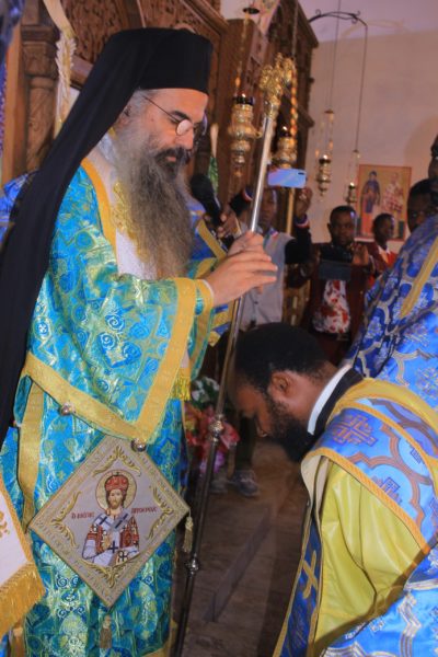 Κατά την διάρκεια της Θείας Λειτουργίας, ο Σεβασμιώτατος, κ. Μελέτιος, με τις ευχές της ΑΘΜ Πάπα και Πατριάρχη Αλεξανδρείας και Πάσης Αφρικής, κ. κ. Θεοδώρου Β’, τέλεσε την εις Πρεσβύτερον χειροτονία του π. Μάρκου Καγιόνγκο, ο οποίος είναι έγγαμος κληρικός και πατέρας 5 παιδιών. Ο Σεβασμιώτατος απευθυνόμενος προς τον νεοχειροτονούμενο, αναφέρθηκε στο δεύτερο βαθμό της Ιερωσύνης, τη στάση που θα πρέπει να έχει μέσα στο χώρο της Εκκλησίας, να υπηρετεί και να αγαπάει τους ανθρώπους και στις δύσκολες στιγμές της ζωής του, να αντλεί δύναμη από την προσευχή και το μυστήριο της Θείας Ευχαριστίας.