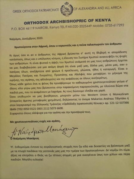 Χριστουγεννιάτικο εόρτιο Μήνυμα δημοσιεύει ο Σεβ. Μητροπολίτης Γέρων Ναϊρόμπι, Yπέρτιμος και Έξαρχος Κένυας κ. Μακάριος υπό τον τίτλο “Χριστούγεννα στην Αφρική, όπου ο κορονοϊός και η πείνα ταλαιπωρούν τον άνθρωπο”. Στο Υστερογράφό του, αναφέρει με συγκίνηση: “Ενθυμούμαι έντονα τις συγκλονιστικές στιγμές που ζω εδώ και δεκαετίες να βρίσκομαι μαζί με τα πτωχά παιδάκια της γειτονιάς μας, την ημέρα των Χριστουγέννων. Δε νομίζω ότι είμαι άξιος να επιτρέπει ο Θεός να ζω τέτοιες στιγμές με μία οικογένεια ίσως των χίλιων και πέρα παιδιών. Μεγάλη ευλογία!”.