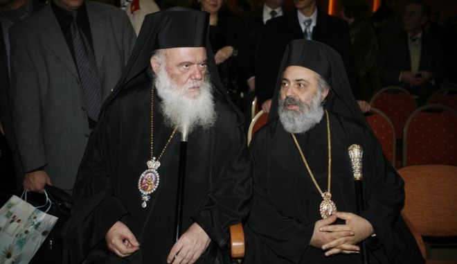 Ο μακαριστός αρχιεπίσκοπος Χριστόδουλος και ο μητροπολίτης Χαλεπίου Παύλος, κατά την τελετή θεμελίωσης σχολικού συγκροτήματος στη Συρία (2003)