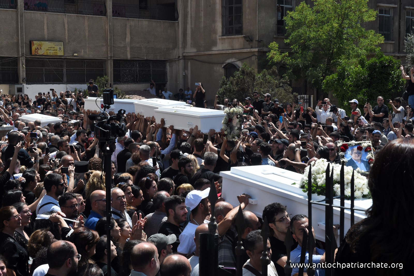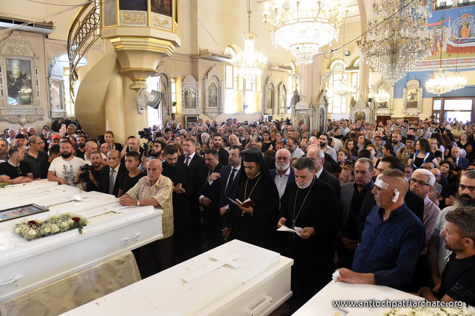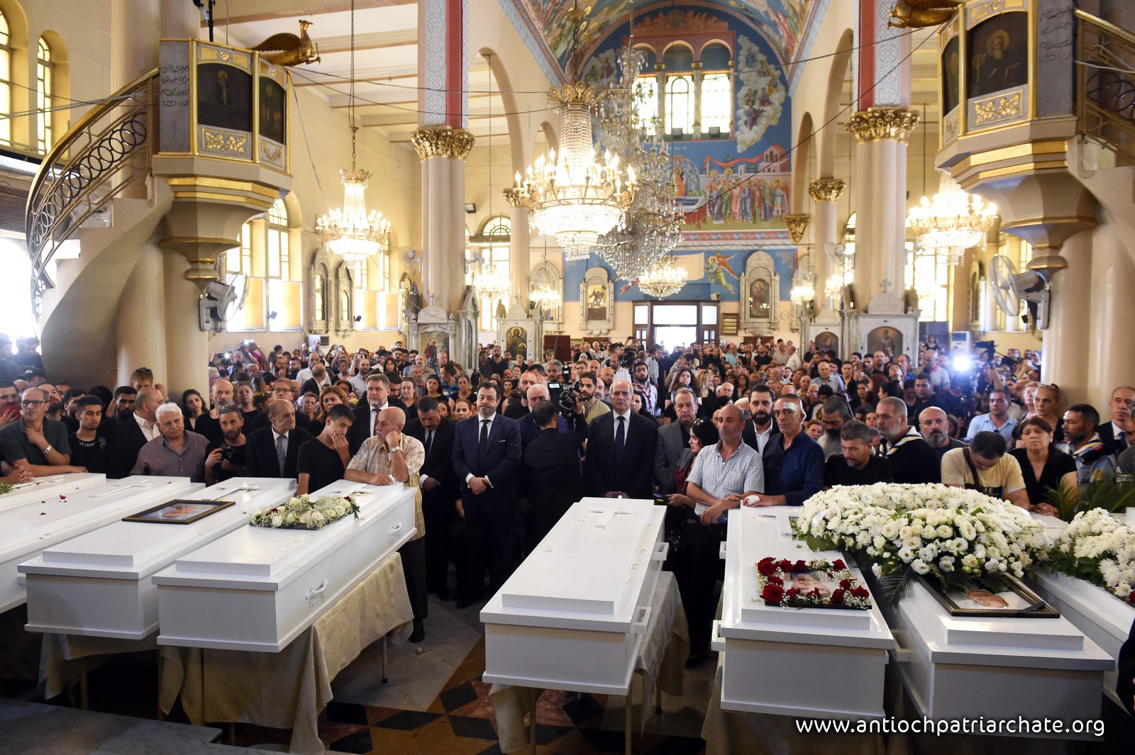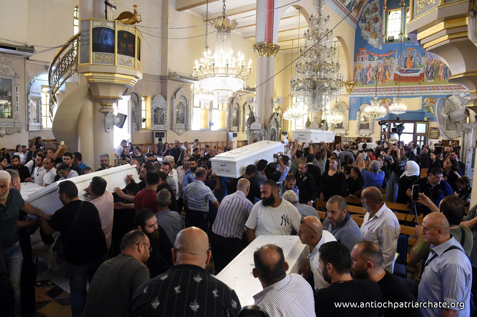 Ο Μακαριώτατος Πατριάρχης Αντιοχείας κ.κ. Ιωάννης, παρουσία Ιεραρχών, κληρικών και πλήθους πιστών τέλεσε, σήμερα το μεσημέρι στον Ιερό Ναό Τιμίου Σταυρού στην επαρχία Αλ-Κασάα, την Εξόδιο Ακολουθία των αθώων θυμάτων της τρομοκρατικής επίθεσης στον Προφήτη Ηλία Δαμασκού, ανάμεσα στα οποία ήταν και παιδιά.