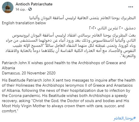 Ο Μακαριώτατος Πατριάρχης Αντιοχείας κ.κ. Ιωάννης έστειλε ευχές στον Μακαριώτατο Αρχιεπίσκοπο Αθηνών και πάσης Ελλάδος κ.κ. Ιερώνυμο και στον Μακαριώτατο Αρχιεπίσκοπο Αλβανίας κ.κ. Αναστάσιο για ταχεία ανάρρωση. Ο Πατριάρχης μόλις ενημερώθηκε ότι οι Αρχιεπίσκοποι νοσούν με κορωνοϊό και νοσηλεύονται στο νοσοκομείο απέστειλε μηνύματα συμπαράστασης και ευχήθηκε “Ο Χριστός, Ιατρός των ψυχών και των σωμάτων και η Υπεραγία Θεοτόκος να τους στέφουν πάντα με φροντίδα και στήριξη”.