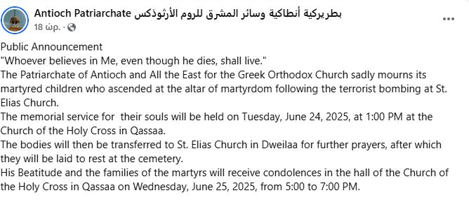 Διαβάστε ακόμη: Σήμερα η Εξόδιος Ακολουθία των θυμάτων της τρομοκρατικής επίθεσης στον Προφήτη Ηλία Δαμασκού