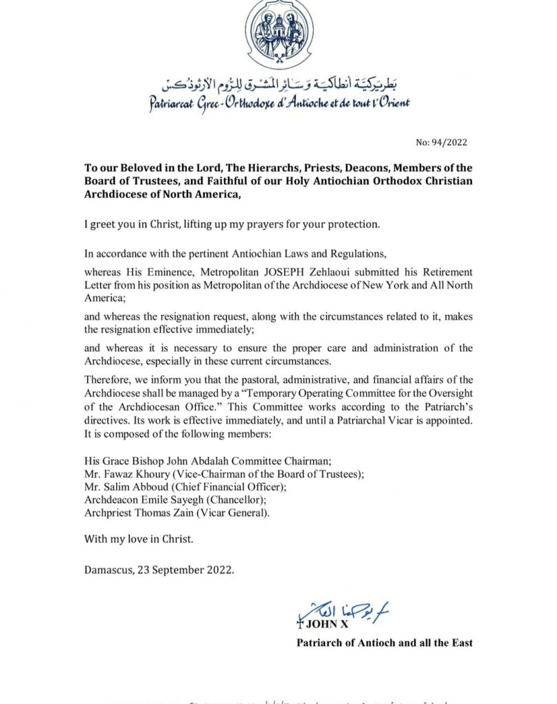 Στον διορισμό πενταμελούς Προσωρινής Επιτροπής Εποπτείας στην Ιερά Μητρόπολη Νέας Υόρκης και Βορείου Αμερικής μετά από την πρόσφατη αποδοχή της παραίτησης του Μητροπολίτη κ. Ιωσήφ, προέβη ο Μακαριώτατος Πατριάρχης Αντιοχείας κ.κ. Ιωάννης Ι’.