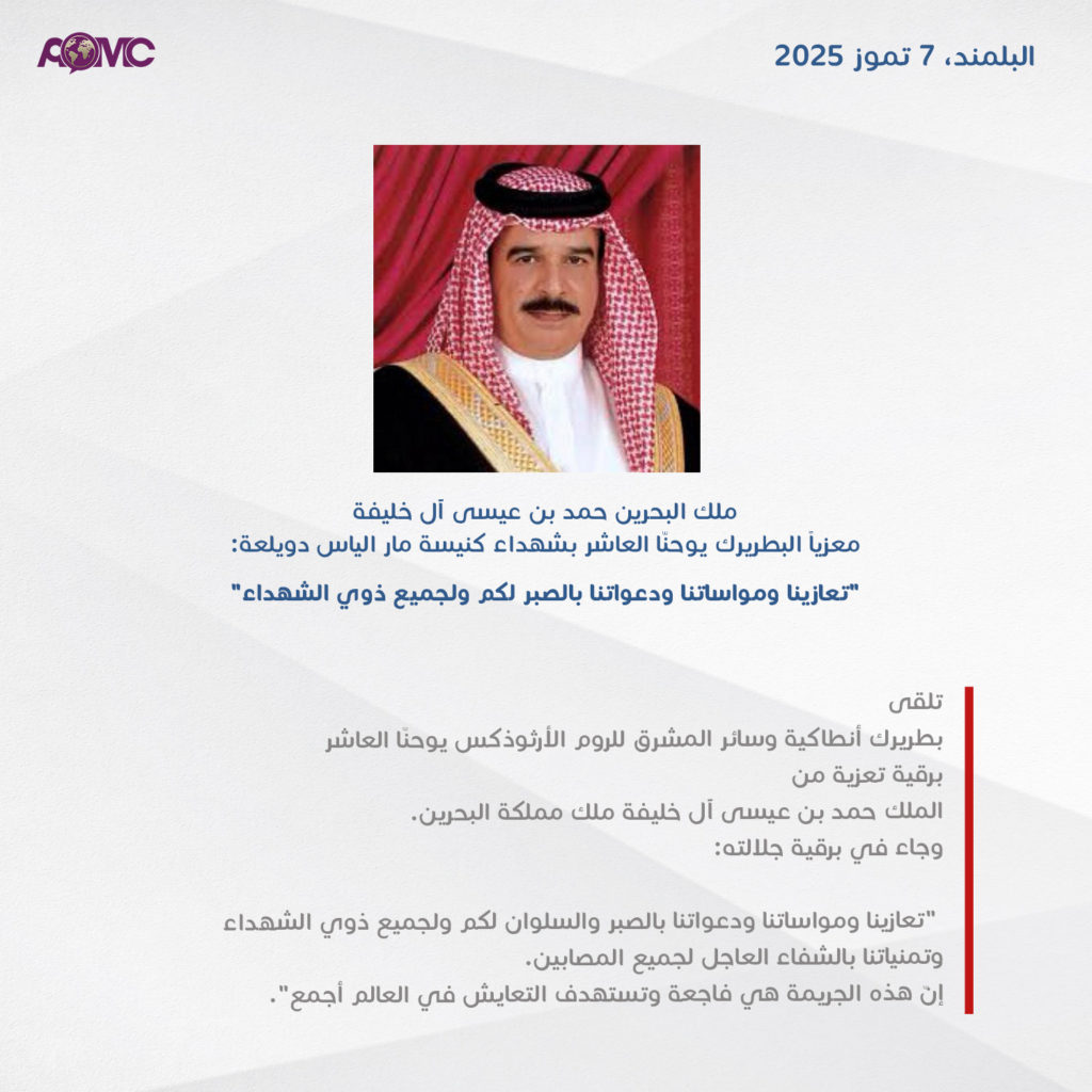 Ο βασιλιάς του Μπαχρέιν Χαμάντ μπιν Ισά Αλ Χαλίφα, με συλληπήριο τηλεγράφημά του προς τον Μακαριώτατο Πατριάρχη Αντιοχείας κ.κ. Ιωάννη, εξέφρασε τα συλλυπητήριά του για τους μάρτυρες της τρομοκρατικής επίθεσης στον Ιερό Ναό στον Προφήτη Ηλία στη Δαμασκό. “”Αυτό το έγκλημα είναι φρικιαστικό”, ανέφερε μεταξύ άλλων στο μήνυμά του.