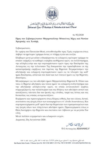 Τις ευχαριστίες του προς τον Σεβ. Μητροπολίτη Μπουένος Άιρες και Νοτίου Αμερικής κ. Ιωσήφ για τη συμπαράστασή του εξέφρασε με Επιστολή του ο Μακαριωτάτος Πατριάρχης Αντιοχείας κ.κ. Ιωάννης, με αφορμή τη φονική έκρηξη στο λιμάνι της Βηρυτού που σημειώθηκε στις 4 Αυγούστου.