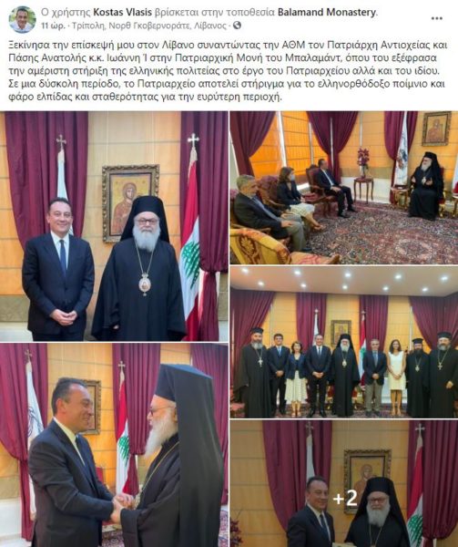 “Ξεκίνησα την επίσκεψή μου στον Λίβανο συναντώντας την ΑΘΜ τον Πατριάρχη Αντιοχείας και Πάσης Ανατολής κ.κ. Ιωάννη Ί στην Πατριαρχική Μονή του Μπαλαμάντ, όπου του εξέφρασα την αμέριστη στήριξη της ελληνικής πολιτείας στο έργο του Πατριαρχείου αλλά και του ιδίου. Σε μια δύσκολη περίοδο, το Πατριαρχείο αποτελεί στήριγμα για το ελληνορθόδοξο ποίμνιο και φάρο ελπίδας και σταθερότητας για την ευρύτερη περιοχή”, έγραψε σε ανάρτησή του ο Έλληνας Υφυπουργός Εξωτερικών.