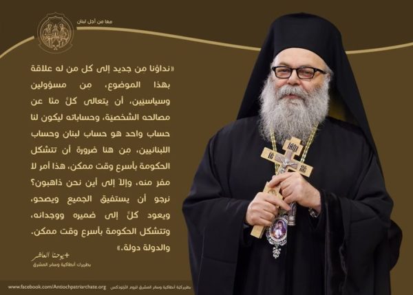 Σε σύντομη δήλωσή του σε τοπικά μέσα ενημέρωσης ο Πατριάρχης Αντιοχείας έκανε για μια ακόμη φορά έκκληση για επίλυση του θέματος στο Λίβανο. Ο Μακαριώτατος Πατριάρχης Αντιοχείας κ.κ. Ιωάννης σημείωσε την αναγκαιότητα διαμόρφωσης κυβέρνησης στη χώρα.