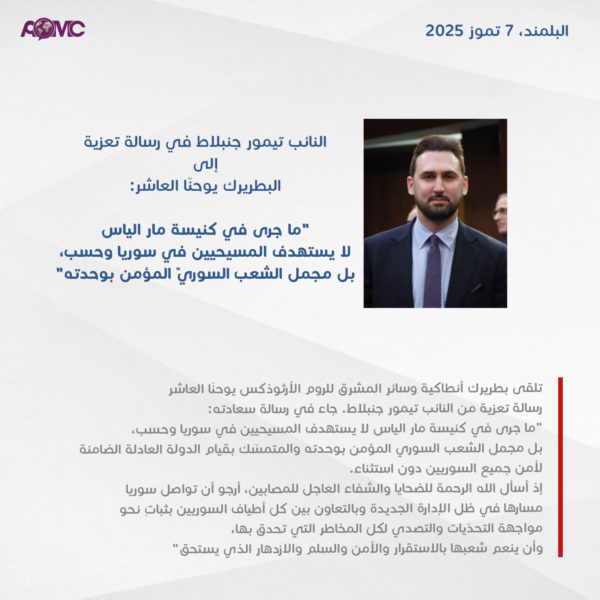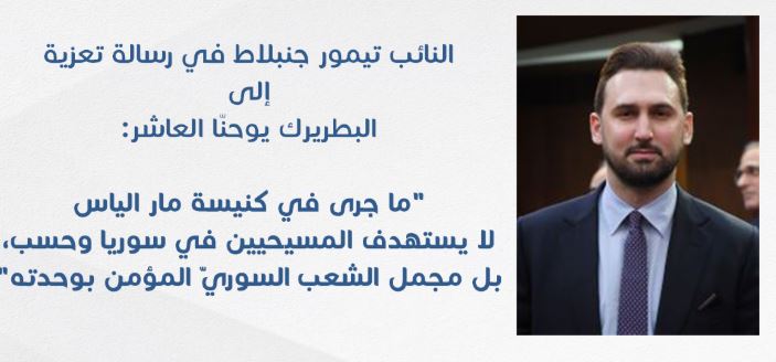 «Αυτό που συνέβη στην εκκλησία του Προφήτη Ηλία (Δαμασκού) δεν στοχεύει μόνο τους Χριστιανούς στη Συρία, αλλά ολόκληρο τον Συριακό λαό που πιστεύει στην ενότητά του». Αυτό γράφει στην συλληπητήρια επιστολή του προς τον Μακαριώτατο Πατριάρχη Αντιοχείας κ.κ. Ιωάννη, ο Ταγμούρ Τζουμπλάτ, Λιβανέζος πολιτικός και ηγέτης του Προοδευτικού Σοσιαλιστικού Κόμματος και επικεφαλής της κοινοβουλευτικής ομάδας του κόμματος Δημοκρατική Συγκέντρωση.