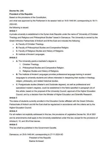 Σύμφωνα με το άρθρο 1 του νόμου 34 και το σχετικό Προεδρικό Διάταγμα, ιδρύεται ένα ιδιωτικό πανεπιστήμιο στην Αραβική Δημοκρατία της Συρίας που ονομάζεται «Πανεπιστήμιο Χριστιανικής Θεολογίας, Θρησκειολογικών και Φιλοσοφικών Σπουδών».