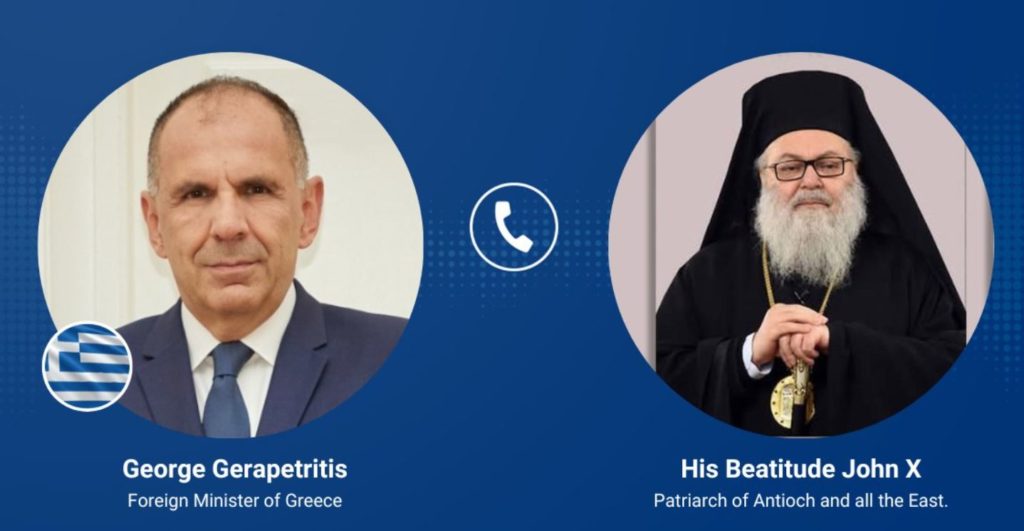 Ο υπουργός Εξωτερικών Γιώργος Γεραπετρίτης επικοινώνησε τηλεφωνικά με τον Πατριάρχη Αντιοχείας κ.κ. Ιωάννη, υπό τη σκιά της αιματηρής τρομοκρατικής επίθεσης στον Προφήτη Ηλία στη Δαμασκό.