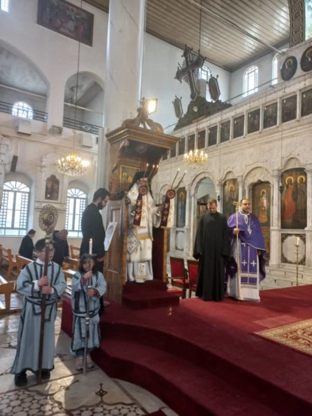 Τη Θεία Λειτουργία τέλεσε, στα αραβικά και στα ελληνικά, ο Επίσκοπος κ. Αρσένιος (Ντάχνταλ), πλαισιούμενος από τους Θεοφιλεστάτους Επισκόπους κ. Ιωάννη (Μπάτας) και κ. Μωυσή (Αλ-Χούρι), καθώς και ιερείς και διάκονοι. Παρόντες για την περίσταση ήταν επίσης ο Μητροπολίτης Χαλεπίου, Αλεξανδρέττας και περιχώρων κ. Εφραίμ (Μααλούλη), ο Πατριαρχικός Επίτροπος κ. Ρωμανός (Αλ-Χανάτ) και ο Επίσκοπος Λαρίσης κ. Μωυσής (Αλ-Χασί).