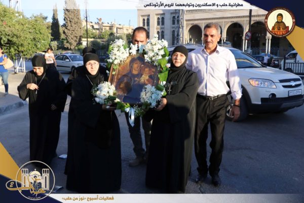 Η ιερά εικόνα έφτασε εν πομπή στον Καθεδρικό Ναό του Προφήτη Ηλία συνοδευόμενη από μοναχές, ενώ την υποδέχθηκε ο Μητροπολίτης Χαλεπίου κ. Εφραίμ με κληρικούς και πλήθος κόσμου.
