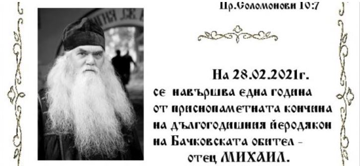 Αρχιερατικό μνημόσυνο τελέστηκε σήμερα στο Μοναστήρι του Μπάτσκοβο για τον έναν χρόνο που πέρασε από την εκδημία του Ιερομονάχου Μιχαήλ, που υπήρξε μακρόβιο μέλος της εκεί μοναστικής αδελφότητας. Το μνημόσυνο τέλεσε ο Σεβασμιώτατος Μητροπολίτης Ρούσσε κ. Ναούμ, συμπαραστατούμενος από τον Θεοφιλέστατο Επίσκοπο Βελίκης κ. Σιώνιο, που είναι και ηγούμενος της Ιεράς Μονής του Μπάτσκοβο, και τους άλλους αδελφούς.
