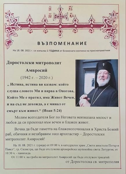 Το Ιερό Μνημόσυνο του μακαριστού Μητροπολίτου τελέστηκε στον Καθεδρικό Ναό των Αγίων Αποστόλων Πέτρου και Παύλου στη Σιλίστρα της Βουλγαρίας. Το Ιερό Μνημόσυνο τέλεσε μετά τη Θεία Λειτουργία ο Σεβασμιώτατος Μητροπολίτης Ρούσσε κ. Ναούμ ενώ συμπροσευχήθηκε ο Μητροπολίτης Δωροστόλου κ. Ιάκωβος.