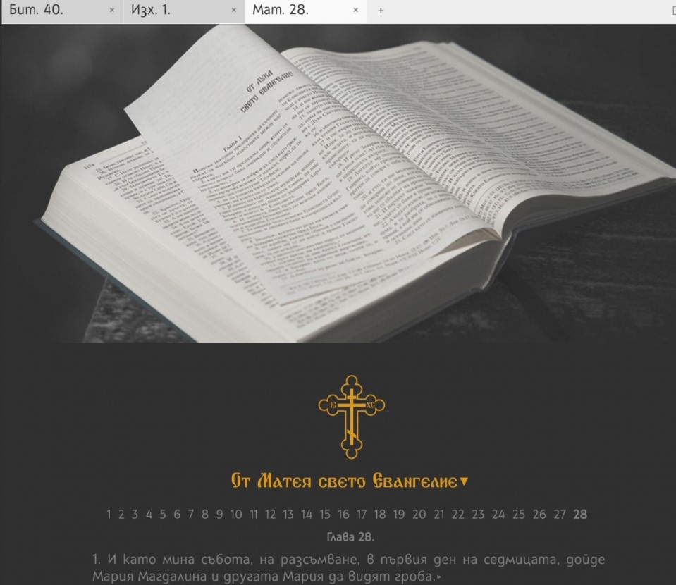 Με την ευλογία της Ιεράς Συνόδου της Βουλγαρικής Ορθόδοξης Εκκλησίας (ήτοι του Πατριαρχείου Βουλγαρίας) η Αγία Γραφή (Παλαιά και Καινή Διαθήκη) γίνεται πλέον διαθέσιμη στον Επίσημο Συνοδικό Ιστότοπο με εντελώς νέα λειτουργικότητα, ηλεκτρονικούς συνδέσμους και σχεδιασμό. Μπορείτε να δείτε τη νέα εφαρμογή εδώ.