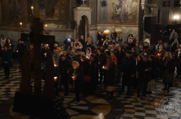 Τη Μεγάλη Πέμπτη στον Πατριαρχικό Καθεδρικό Ναό Αγίου Αλεξάνδρου Νέφσκι της Σόφιας τελέστηκε η ακολουθία των Αγίων Παθών, στην οποία διαβάζονται τα δώδεκα χωρία από τα τέσσερα Ευαγγέλια, που μιλούν για τις τελευταίες ημέρες του Σωτήρος.
