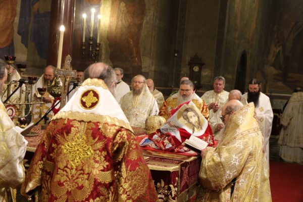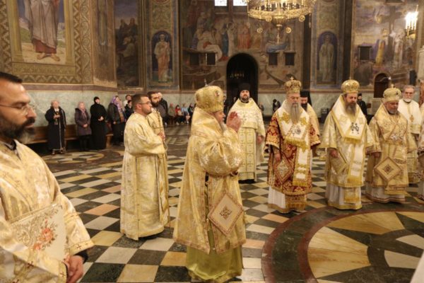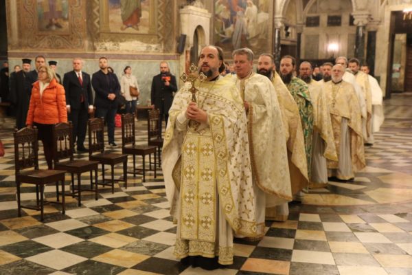 Της Πολυαρχιερατικής Θείας Λειτουργίας προεξήρχε ο Μητροπολίτης Μεγάλου Τυρνόβου κ. Γρηγόριος συλλειτουργούντων των μελών της Ιεράς Συνόδου του Πατριαρχείου Βουλγαρίας, Μητροπολιτών Λόβετς κ. Γαβριήλ, Φιλιππουπόλεως κ. Νικολάου, Βάρνας και Μεγάλης Πρεσλάβας κ. Ιωάννη, Νευροκοπίου κ. Σεραφείμ, Ρούσσε κ. Ναούμ, Στάρα Ζαγκόρας κ. Κυπριανού, Βράτσης κ. Γρηγορίου, Βιδινίου κ. Δανιήλ και Δοροστόλου κ. Ιακώβου, καθώς και των Βοηθών Επισκόπων Μελενίκου κ. Γερασίμου, Μπελογκραντσίκ κ. Πολυκάρπου, Μπρανίτσης κ. Παχωμίου, Γλαβινίτσης κ. Μακαρίου, του Αρχιμανδρίτη Βασσιανού Ζμέγεφ, προϊσταμένου του Μετοχίου του Πατριαρχείου Μόσχας στη Σόφια, πλαισιουμένων από ιερείς της Ιεράς Μητροπόλεως Σόφιας.