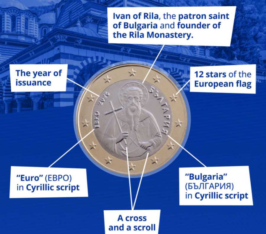 Να σημειωθεί ότι στην μία όψη του νομίσματος του 1 ευρώ υπάρχει ανάγλυφη η μορφή του Αγίου Ιωάννη της Ρίλας, ενός μεγάλου Αγίου της Βουλγαρίας και της Ορθοδοξίας στα Βαλκάνια.