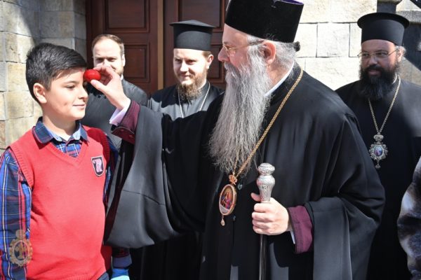 Ο Σεβασμιώτατος κ. Νικόλαος βοήθησε τα παιδιά στη ζωγραφική, έδωσε σε κάθε παιδί λιχουδιές, δώρα και ένα κόκκινο αυγό με την ευλογία να είναι υγιή και γερά και να φέρνουν πάντα χαρά και ευτυχία, όπως η νέα ζωή που γεννιέται από το αυγό.