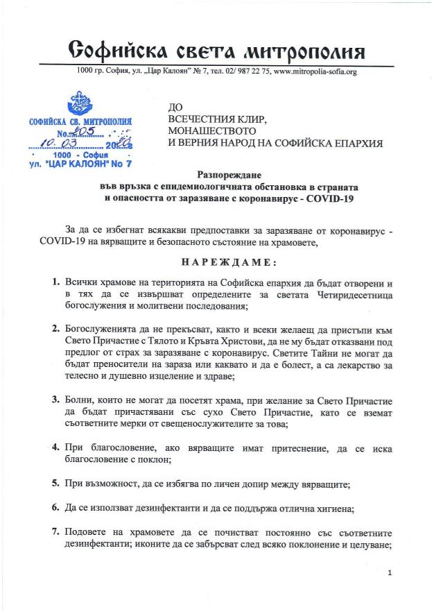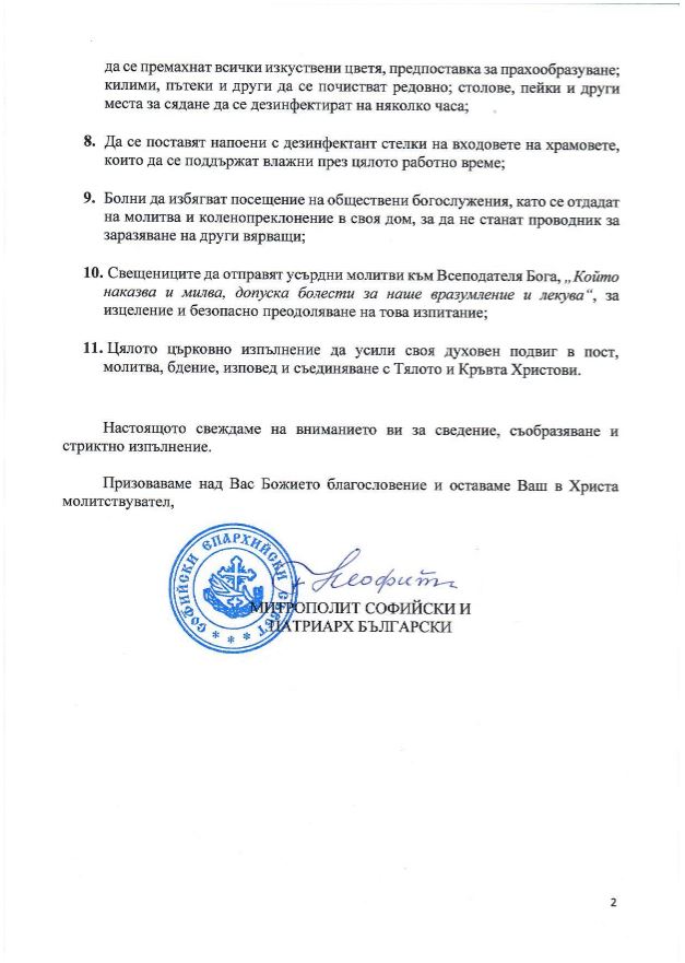 Ο Πατριάρχης μεταξύ άλλων αναφέρει πως όλοι οι ναοί στην Μητροπολιτική περιφέρεια της Σόφιας θα παραμείνουν ανοικτοί, ενώ κανονικά θα τελούνται όλα τα ιερά μυστήρια και οι ιερές ακολουθίες.
