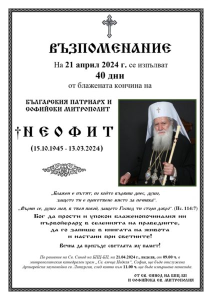 Την Κυριακή 21 Απριλίου 2024 στον Ιερό Μητροπολιτικό Ναό της Αγίας Κυριακής θα τελεστεί το τεσσαρακονθήμερο μνημόσυνο του μακαριστού Πατριάρχη κυρού Νεοφύτου. Θα προηγηθεί η τέλεση Συνοδικής Θείας Λειτουργίας προεξάρχοντος του Αντιπροέδρου της Ιεράς Συνόδου, Μητροπολίτη Βράτσης κ. Γρηγορίου.