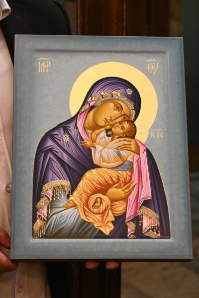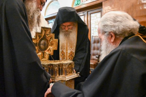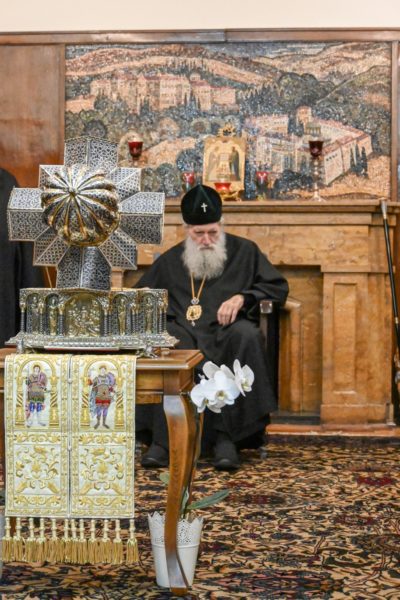 Ο Μακαριώτατος, αφού προσκύνησε τα ιερά λείψανα και το απότμημα του Τιμίου Σταυρού, που του προσκόμισαν, ευλόγησε και ευχαρίστησε τον Ηγούμενο της Ιεράς Μονής Εσφιγμένου Αγίου Όρους, Αρχιμανδρίτη Βαρθολομαίο, και τη μοναστηριακή αδελφότητα, που κόμισαν για πρώτη φορά τα άγια λείψανα στην πρωτεύουσα της Βουλγαρίας. Εκείνος με τη σειρά του επέδωσε στον Μακαριώτατο μια εικόνα της Παναγίας της Ελεούσας.