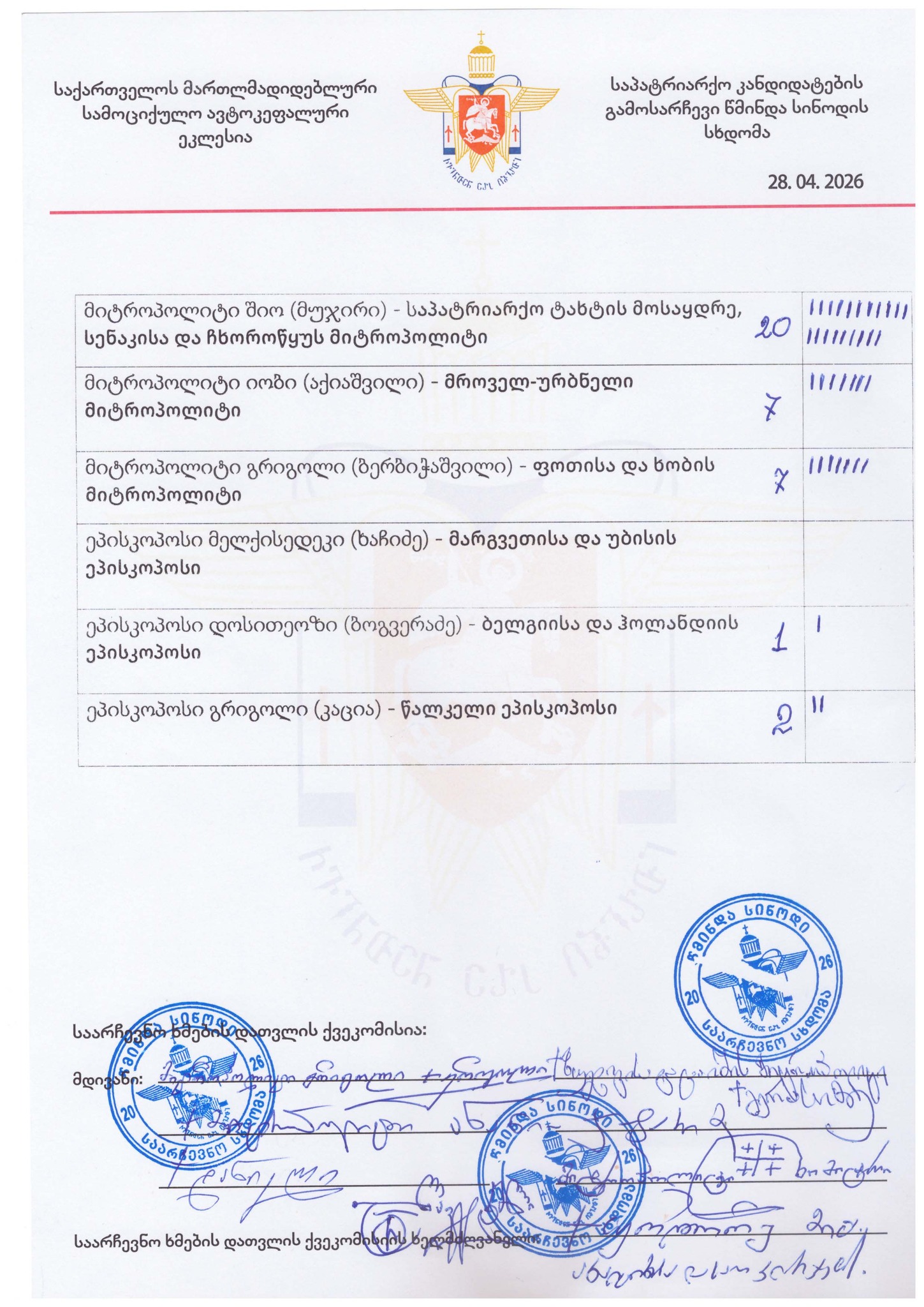 Μητροπολίτης Σενάκι και Τσχορότσκου κ. Σιώ 20 ψήφοι