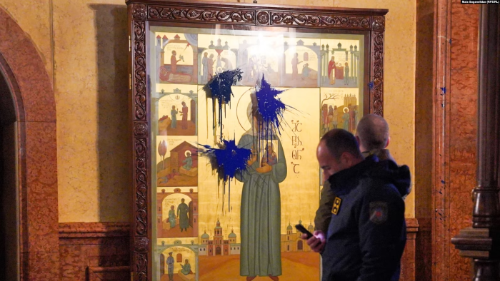 In #Georgia, unknown persons poured blue paint on the icon of Matrona of Moscow in Holy Trinity Cathedral of Tbilisi, which has an image of Stalin on it