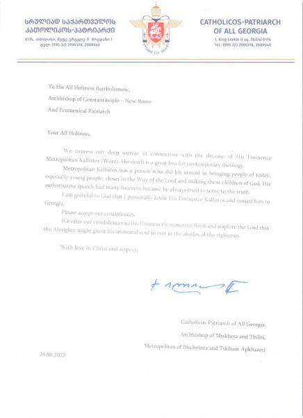 “Ήταν ένας άνθρωπος που προσπαθούσε με κάθε τρόπο να φέρει τους ανθρώπους της εποχής μας, και κυρίως τη νεολαία, πιο κοντά στον δρόμο του Κυρίου και να τους κάνει παιδιά του Θεού”. Αυτά ανέφερε στο συλλυπητήριο μήνυμά του ο Μακαριώτατος Πατριάρχης Γεωργίας κ.κ. Ηλίας Β’ για την εις Κύριον εκδημία του μακαριστού Μητροπολίτη Διοκλείας κυρού Καλλίστου Ware.