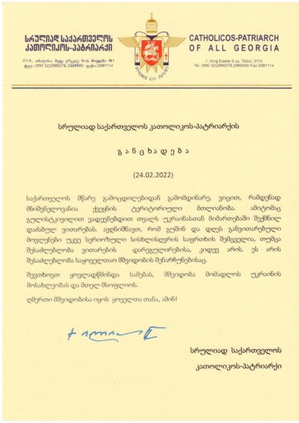 Σε δήλωσή του ο Προκαθήμενος της εν Γεωργία Ορθοδόξου Εκκλησίας αναφέρει ότι ο ίδιος και ο λαός της Γεωργίας γνωρίζουν καλά τι σημαίνει να απειλείται η εδαφική σου ακεραιότητα τονίζοντας ότι παρακολουθεί με πόνο καρδιάς τις εξελίξεις στην Ουκρανία.