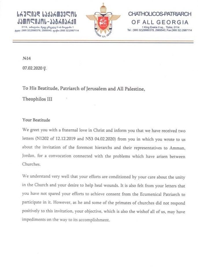 Ο επικεφαλής της υπηρεσίας δημοσίων σχέσεων του Γεωργιανού Πατριαρχείου, δημοσίευσε την επιστολή του Πατριάρχη Γεωργίας κ.κ. Ηλία, προς τον Πατριάχη Ιεροσολύμων,κ.κ.Θεόφιλο στην οποία του αναλύει τους λόγους για τους οποίους αποφάσισε να μην παρευρεθεί στη συνάντηση στο Αμάν.