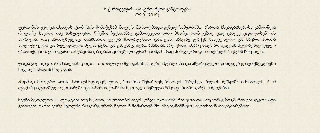 Έκκληση για ενότητα στον Ορθόδοξο Κόσμο, με αφορμή την χορήγηση του Τόμου της Αυτοκεφαλίας στην Ορθόδοξη Εκκλησία της Ουκρανίας απευθύνει το Πατριαρχείο της Γεωργίας.